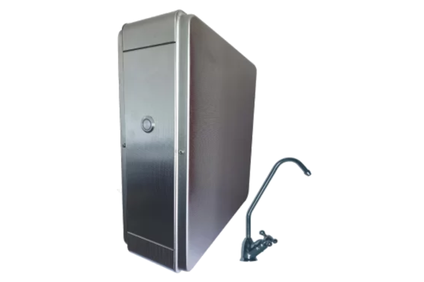 W kompaktowej obudowie ze stali nierdzewnej zamknięto na wskroś nowoczesne rozwiązanie: sześciostopniowe urządzenie osmotyczne wspomagane pompą podnoszącą ciśnienie wody zasilającej. Dzięki nowej technologii wytwarzania, zastosowana membrana 400 GPD z powodzeniem mieści się w tak niedużej obudowie. Przy współpracy z pompą wspomagającą uzyskuje się z niej wydajność dochodzącą do 40 l/h, a urządzenie może pracować już przy ciśnieniu sieci od 1,5 bara.Tak duża wydajność pozwoliła na rezygnację ze zbiornika magazynującego oczyszczoną wodę, co zdecydowanie wpływa na ilość miejsca potrzebnego do zainstalowania urządzenia. Urządzenie wymaga podłączenia do sieci elektrycznej 230 V.